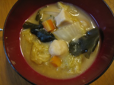 次に、好きな具でお味噌汁を作り、お味噌を溶いた後、団子を加えてひと煮立ちさせてできあがり(*’▽’)