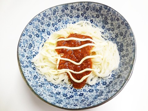 1人分の分量です。そうめん 2束をゆでて水でしめておきます。その上に『国産大豆そぼろのベジ辛醤』 1/2袋とマヨネーズをかけたらできあがり💖