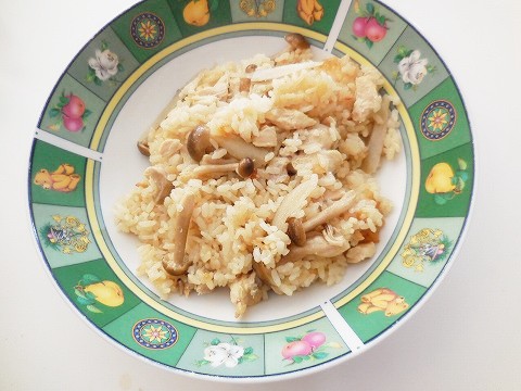 お米 1.5合を洗って少なめの水に浸しておきます。しめじ 1/3株はほぐし、鶏肉(胸でもモモでもOK) 200gは2㎝角に切り、ゴボウ 1/4本はさきがけや細切りにします。炊飯釜にお米と水を入れ、 『チョーコー 九州だし 寄せ鍋つゆ』 1袋、酒 大さじ1、ごま油 大さじ1を加えて1.5合の水加減にしてからしめじ、鶏肉、ごぼうをのせて炊飯すればできあがり💖