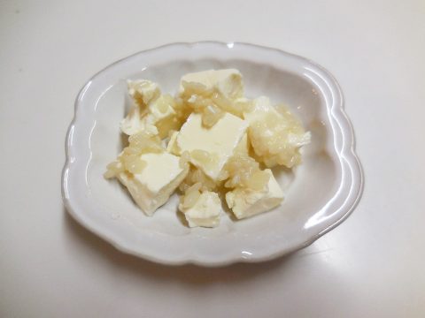 個包装のクリームチーズ 3個は1㎝角くらいに手でちぎります。『やさかの有機塩こうじ』 大さじ1/2を絡めて1日置いたらできあがり💖