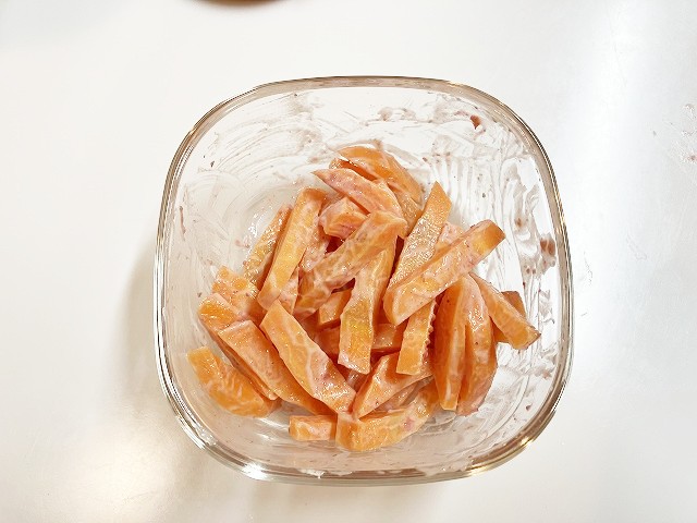 にんじん 1/2本は5㎜くらいの拍子切りにして2~3分ゆでて水を切ります。器にマヨネーズ 小さじ2、『特別栽培 紅玉ねり梅(チューブ)』 チューブで2㎝くらい、メープルシロップ 小さじ1/2を合わせてよく混ぜ、にんじんに絡めたらできあがり💖