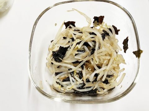のりともやしに『金笛 春夏秋冬だしの素』がよくなじんでとってもおいしいんですよ~😍