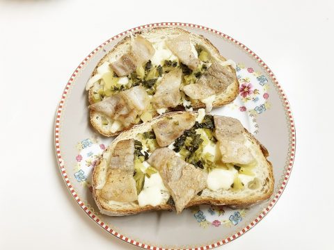 豚バラ肉 2枚はフライパンで焼いて1㎝幅に切っておきます。お好みのパンにピザ用チーズを薄くのせ、『オーサワの高菜漬(きざみ)』 の水気をよく切ってチーズの上にのせます。さらに豚バラ肉をのせたらオーブントースターでこんがり焼いたらできあがり💖