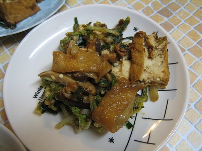 フライパンにごま油少々を入れて熱し、白菜、しいたけを炒め、全体に油がまわったら、にら、厚揚げ、『きざみ庄内麩』を入れてざっと炒め、最後に合わせ調味料を入れて全体に絡めたら出来上がり~