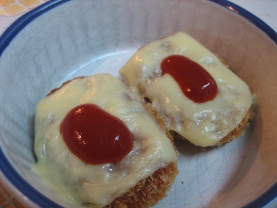 もう簡単すぎて申し訳ないくらい。。。なんですがぁ。『ミニコロッケ<リッチランチ>』を180℃の油で3~4分ほどあげて、アツアツのうちにスライスチーズをのせ、溶けたらケチャップを少しのせてできあがり~\(^o^)/