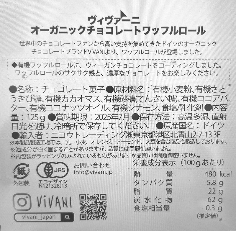 他の画像を見る 取寄せ商品 有機ワッフルロールに、ヴィーガンチョコレートをコーティング 【今季終売2025】 ViVANI オーガニックチョコレート ワッフルロール(カカオ52%) 125g|ニコウトレーディングニコウトレーディング 【取寄せ】 有機JAS 季節品 NEW No. 167073- 販売価格 ¥ 1,188 税込 在庫切れ 詳細を見る お気に入りに登録する